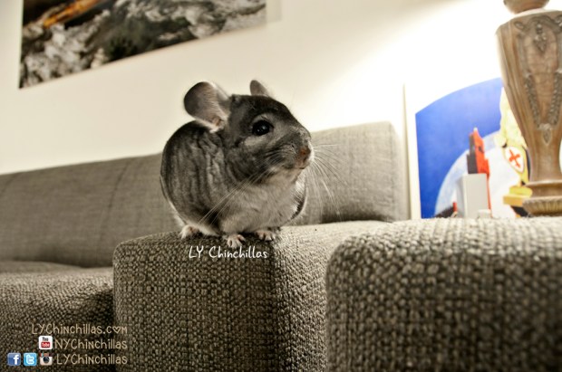 Train. I don’t use treats when I train, I simply use the concept of ‘playtime’ vs. ‘home’. If they want to be out, they have to be good. If I see someone lingering by a wall for too long, I’ll say his/her name in the same manner I’d speak to a disorderly 4-year-old or a misbehaving dog – I’ll utilize the don’t you dare tone. They will hear you, and if they know you well enough, they’ll turn to you and be aware that you are talking to them. Sometimes they’ll stare right at you as they decide their playtime fate, chomping into a picture frame or art piece. Then, they’re headed home to think about what they’ve done. Less intellectual chins may never put it together, wondering with the same fascination each and every time why they’re going back to their cage! However, most chins will begin to see a trend in playtime consequences and learn what they can and can’t bite. I leave chew toys out for them, and allow them to bite on certain furniture such as my barn wood table and wicker chair. Everything else will simply buy them cage time. Again, you must be present in order to train. You can’t be sending mixed messages while they’re out (i.e. when you’re lazing they can bite, when you’re training they can’t), as it defeats the consistency required to teach & learn. If my chins are good, they can be out for up to 45 minutes before they decide they want to fall asleep, tap on the door to go home, or need a sip of water. I’ve found that some of my chins are now able to communicate their needs to me, which is extremely rewarding to recognize.